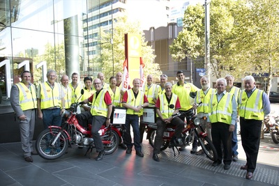 Organised by a group of friends to support the PCFA, the 2013 Male Bag Ride saw a group of 26 participants, including AFL legend David Parkin, complete the 4400 km journey from Perth to Melbourne over a period of 10 days. Starting out on 3 April, each member of the team rode an ex-postie Honda 110 cc motorbike, as ridden by postmen across Australia.