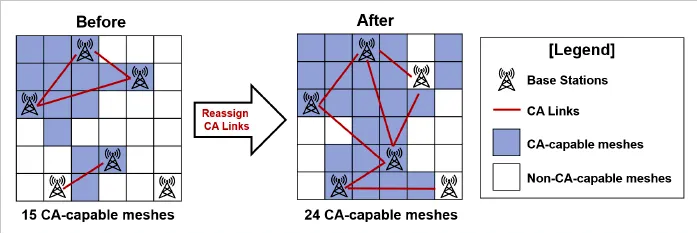 SoftBank aimed to expand the coverage area of CA by optimising base station settings using quantum computing technology. CA is a technology that enables high-speed, stable communication by simultaneously utilising multiple frequency bands. To function, it requires predefined associations between base stations, referred to as ‘CA links’. However, as the number of base stations increases, determining the optimal CA link configuration becomes exponentially more complex. For instance, selecting pairs from 10 base stations yields 45 combinations. Since each pair can either be linked or not, the total number of possible CA link patterns reaches 35 trillion (245). Moreover, constraints such as the maximum number of CA links assignable to each base station further complicate the task, making it extremely difficult to identify the optimal combination that maximises CA-enabled area coverage.