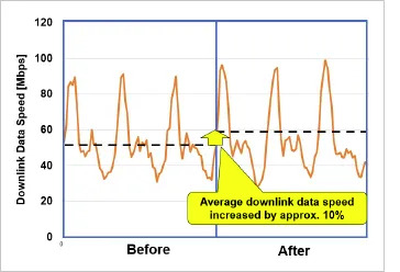 When this configuration was applied to 5G base stations operating in a specific area of Tokyo, the CA coverage area expanded and the average downlink data speed improved by approximately 10%. In addition, both the CA utilisation ratio (the proportion of connections utilising CA) and the amount of data transmitted via secondary cells increased by up to 50%.